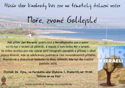 Všichni bratři a sestry, vážení a milí příznivci našich tématických večerů! Náš přítel Jan Kovanic (publicista z Neviditelného psa a autor sci-fi) byl v Izraeli už pětkrát, a napsal o tom knihu Mír v Izraeli. Ze svého archivu pro nás vybral sérii fotografií památek a přírody v okolí jezera Kineret, kde se odehrávala podstatná část Číst dále ...